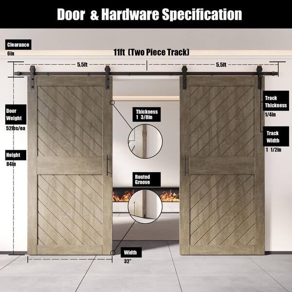 XT2 32 in. x 84 in. C-Panel Classic Gray Slanted Stripe Design Double Pine Wood Sliding Barn Door with Hardware Kit