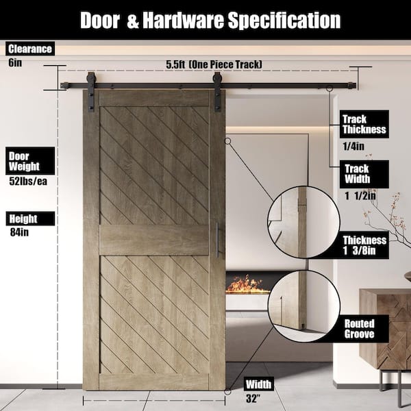 XT2 32 in. x 84 in. C-Panel Classic Gray Slanted Stripe Design Solid Pine Wood Sliding Barn Door with Hardware Kit