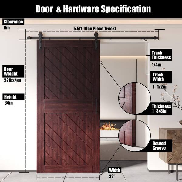 XT2 32 in. x 84 in. C-Panel Red Mahogany Slanted Stripe Design Solid Pine Wood Sliding Barn Door with Hardware Kit