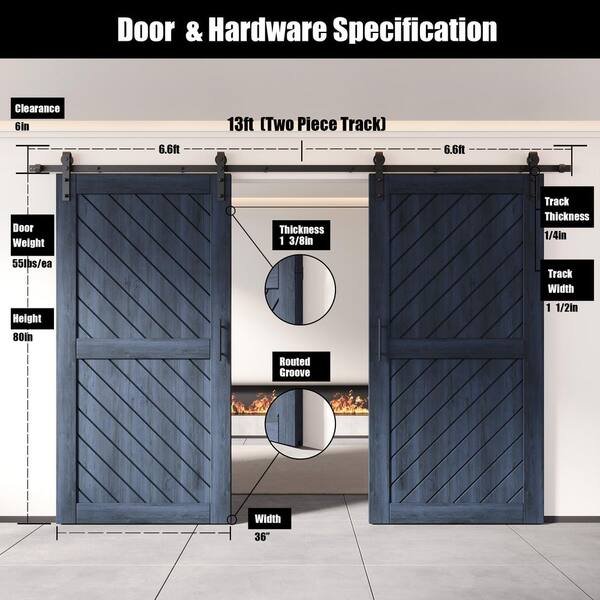 XT2 36 in. x 80 in. C-Panel Navy Slanted Stripe Design Double Pine Wood Sliding Barn Door with Hardware Kit