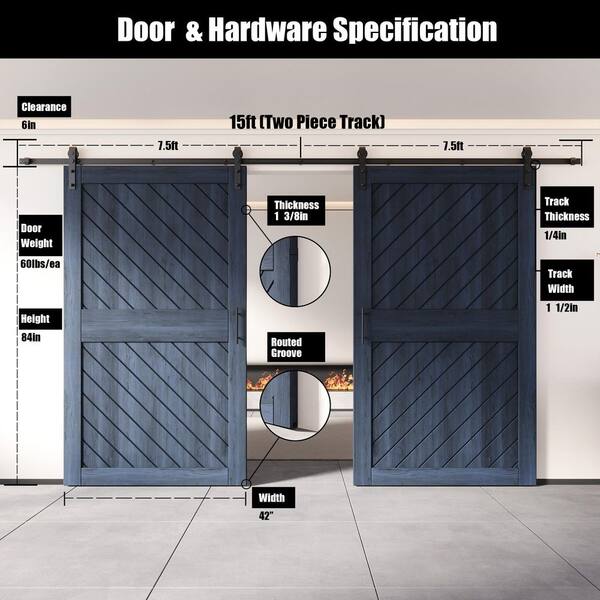 XT2 42 in. x 84 in. C-Panel Navy Slanted Stripe Design Double Pine Wood Sliding Barn Door with Hardware Kit