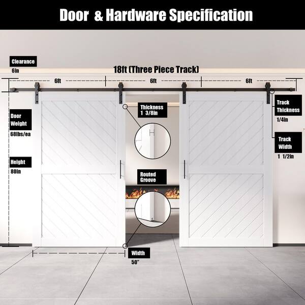XT2 50 in. x 80 in. C-Panel White Slanted Stripe Design Double Pine Wood Sliding Barn Door with Hardware Kit