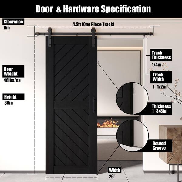 XT3 26 in. x 80 in. C-Panel Black Slanted Stripe Design Solid Pine Wood Sliding Barn Door with Hardware Kit