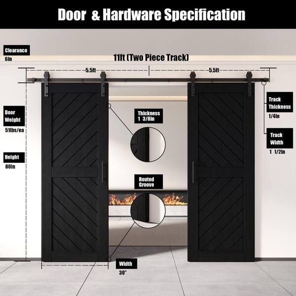 XT3 30 in. x 80 in. C-Panel Black Slanted Stripe Design Double Pine Wood Sliding Barn Door with Hardware Kit