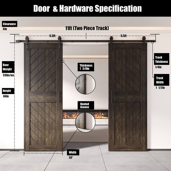 XT3 30 in. x 84 in. C-Panel Ebony Slanted Stripe Design Double Pine Wood Sliding Barn Door with Hardware Kit