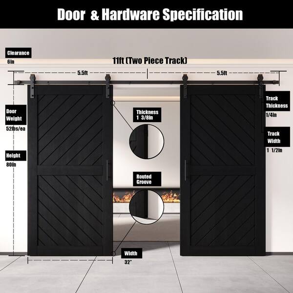 XT3 32 in. x 80 in. C-Panel Black Slanted Stripe Design Double Pine Wood Sliding Barn Door with Hardware Kit