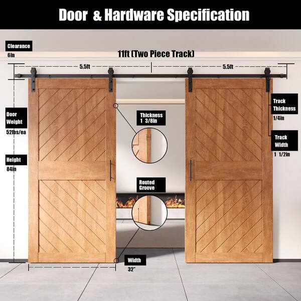 XT3 32 in. x 84 in. C-Panel Early American Slanted Stripe Design Double Pine Wood Sliding Barn Door with Hardware Kit