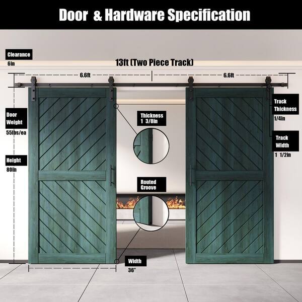 XT3 36 in. x 80 in. C-Panel Royal Pine Slanted Stripe Design Double Pine Wood Sliding Barn Door with Hardware Kit