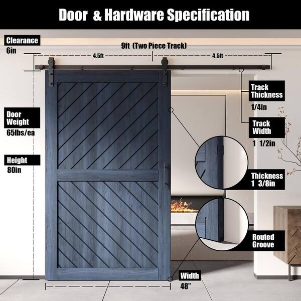 XT3 48 in. x 80 in. C-Panel Navy Slanted Stripe Design Solid Pine Wood Sliding Barn Door with Hardware Kit
