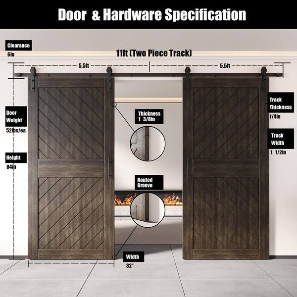 XT4 32 in. x 84 in. C-Panel Ebony Slanted Stripe Design Double Pine Wood Sliding Barn Door with Hardware Kit