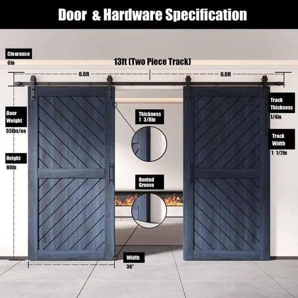 XT4 36 in. x 80 in. C-Panel Navy Slanted Stripe Design Double Pine Wood Sliding Barn Door with Hardware Kit