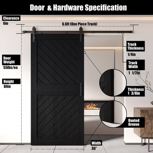 XT4 36 in. x 84 in. C-Panel Black Slanted Stripe Design Solid Pine Wood Sliding Barn Door with Hardware Kit