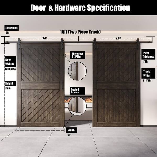 XT4 42 in. x 84 in. C-Panel Ebony Slanted Stripe Design Double Pine Wood Sliding Barn Door with Hardware Kit