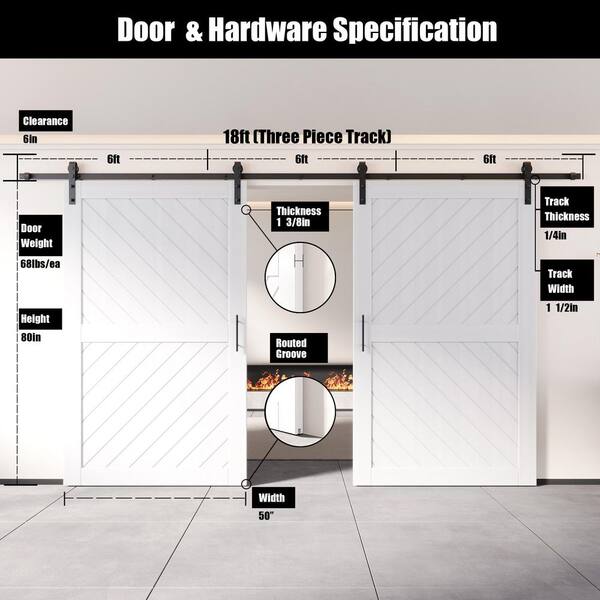 XT4 50 in. x 80 in. C-Panel White Slanted Stripe Design Double Pine Wood Sliding Barn Door with Hardware Kit