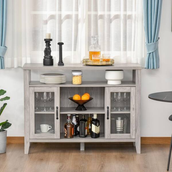 Grey Storage Sideboard with 3-Open Compartments, 2-Framed Glass Door Cabinets and Anti-Topple