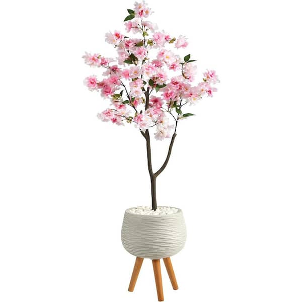 5.25 ft. Artificial Cherry Blossom Tree in White Planter, Artificial Indoor Home Decor Plant