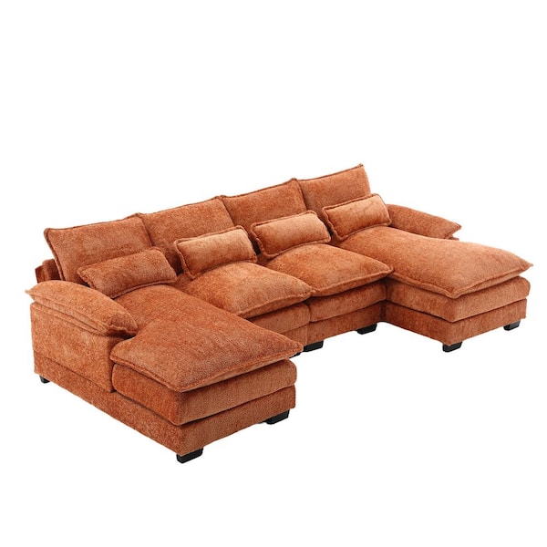 110 in. Rolled Arm 4-piece U-Shaped Modular Boucle Fabric Sectional Sofa Couch in Orange with 2 Cushions and 4 Pillows
