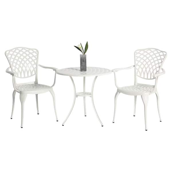 3-Piece Outdoor White Cast Aluminum Patio Bistro Set with Umbrella Hole Table and Chairs with Armrest and Set of 2