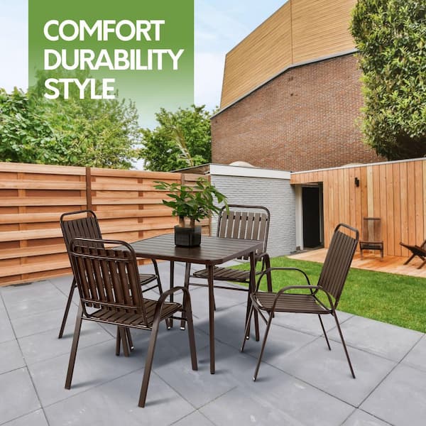 5-Piece Steel Patio Outdoor Dining Set 4 Plastic Stackable PVC Chairs and 1-Dining Table Brown