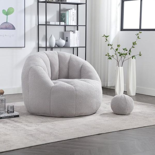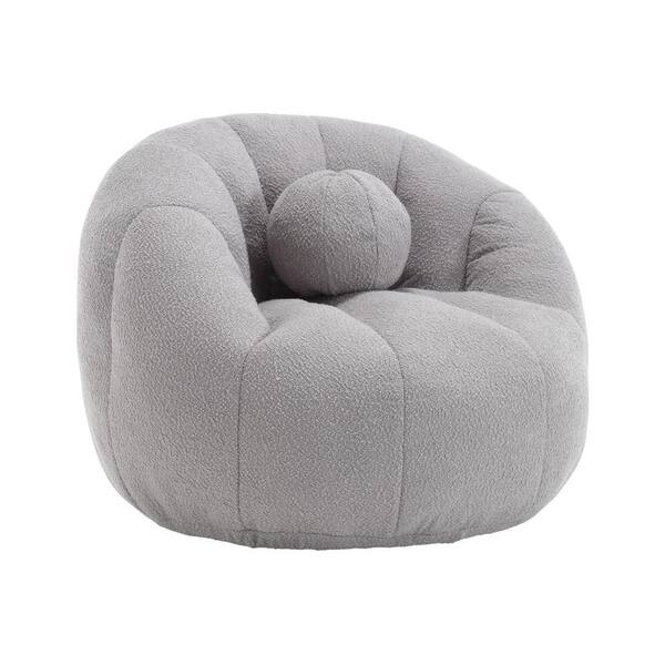 Modern Comfy Foam Grey Boucle Bean Bag Round Accent Arm Chair with Pillow