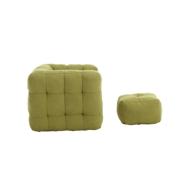 Modern Olive Green Boucle Square Bean Bag Accent Chair with Ottoman