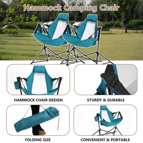Oversized Folding Portable Swinging Hammock Chairs in Blue with Stand and Storage Bag Set of 2