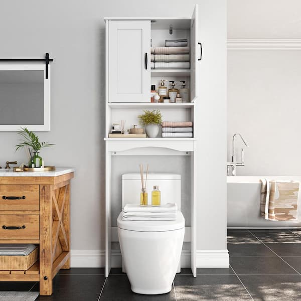 Shaker 23.6 in. W x 65 in. H x 8.25 in. D White Over The Toilet Storage with Doors and Open Shelves