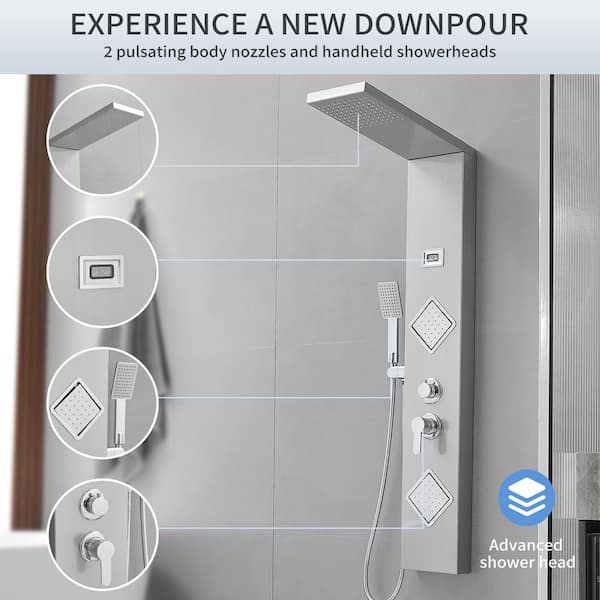 • 3-in-1 shower panel with rainfall, massage jets, and handheld