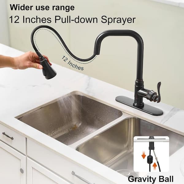 3-Mode Oil Rubbed Bronze 14.5 in. H Pull Down Sprayer Kitchen Faucet with 360° Swivel Spout, Deck Plate and Hoses