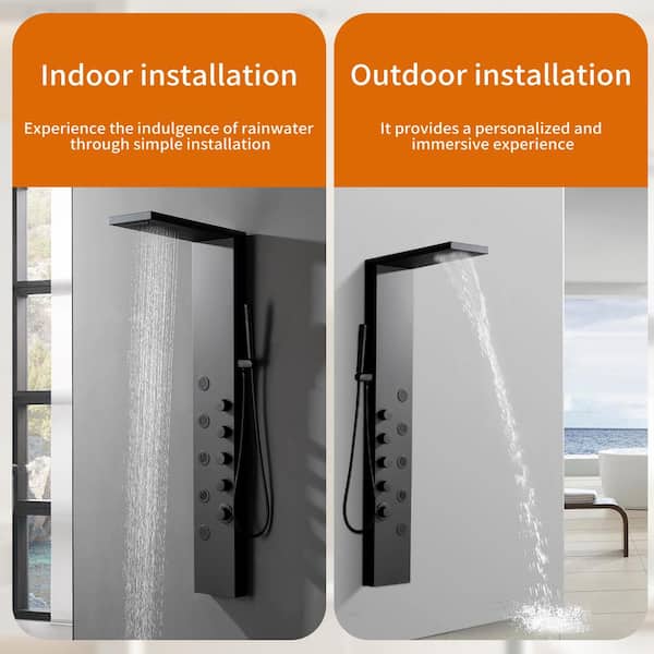 4-in-One 5-Jet Shower Panel System with Rainfall Waterfall Shower Head and Body Spray in Matte Black, Easy to Install