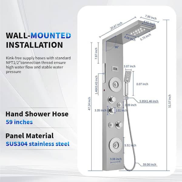 • 6-in-1 shower panel with rainfall, waterfall, and jets