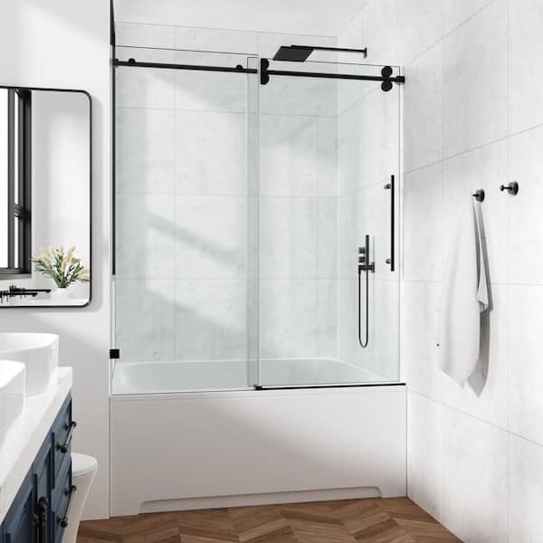 56-60 in. W x 76 in. H Sliding Frameless Shower Door in Matte Black with Clear Glass