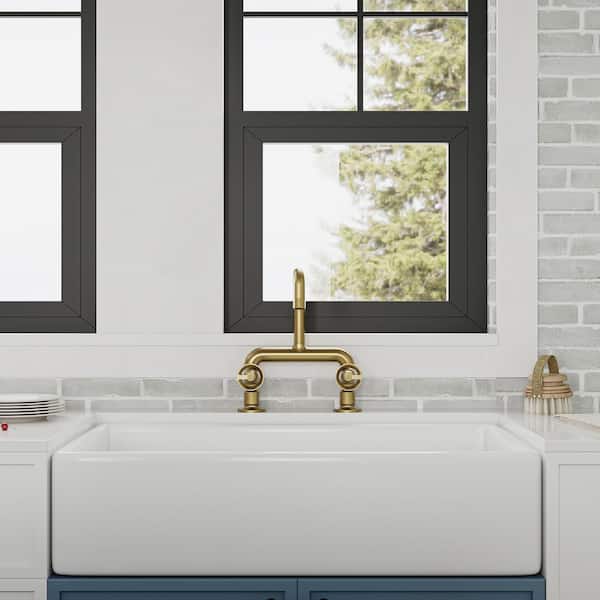 Double Handle Deck Mount 8 in. Center Gooseneck Standard Kitchen Faucet in Brushed Gold