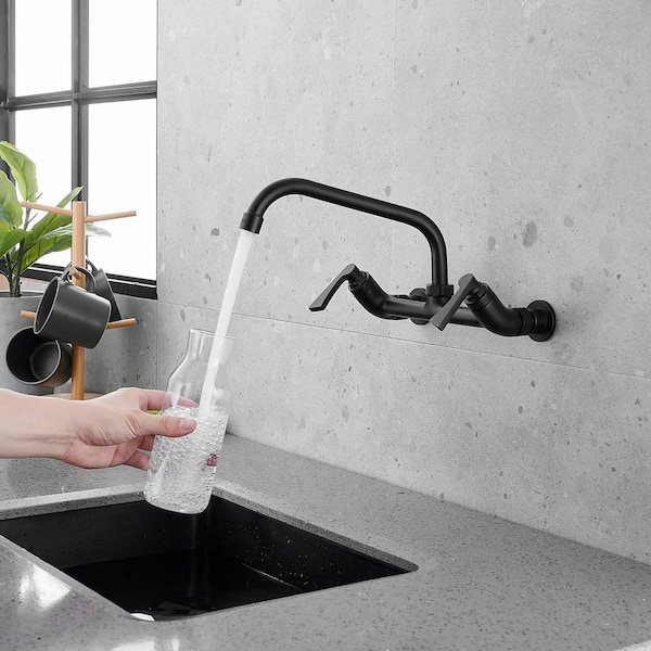 Double Handle Wall Mount Utility Faucet with 8 in. Swivel Spout Standard Kitchen Faucet in Matte Black