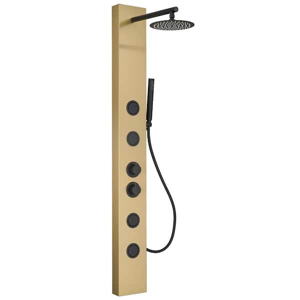 Dual 3-in-1 4-Jet Rainfall Shower Panel System with Rainfall Waterfall Shower Head and Shower Wand in Black Gold