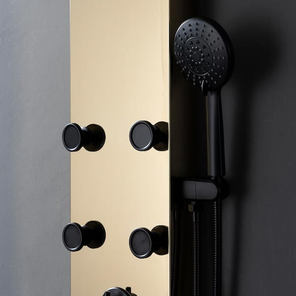 Dual 3-in-1 6-Jet Rainfall Shower Panel Tower System with Rainfall Waterfall Shower Head and Shower Wand in Black Gold