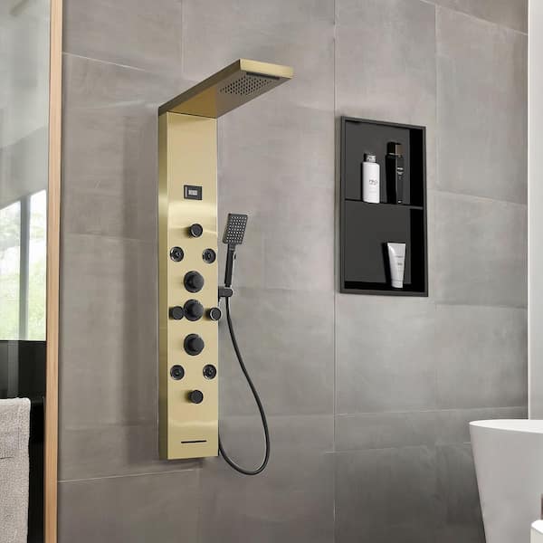 Dual 6-in-One 8-Jet Shower Panel Tower System with Rainfall and Waterfall Head in Black and Gold, Massage Body Jets
