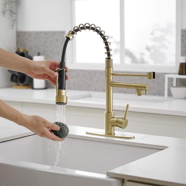 Pro Style Spring Single Handle Brushed Gold 18.4 in. H Dual Spout Pull-Down Kitchen Faucet W/ 180 Swivel
