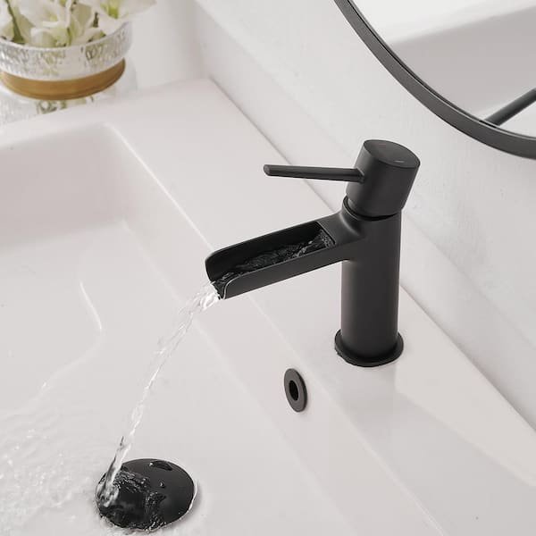 Single Handle Single Hole Bathroom Faucet with Drain Kit Included and Adjustable Flow Rate in Matte Black