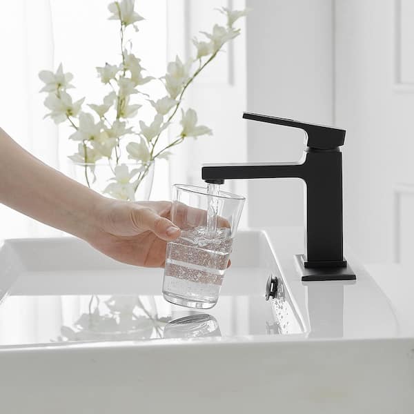 Single Handle Waterfall Vanity Faucet in Matte Black with Deck Plate and Drain
