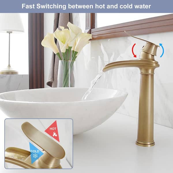 Single Handle Waterfall Vessel Sink Faucet with Drain Kit Included in Antique Brass