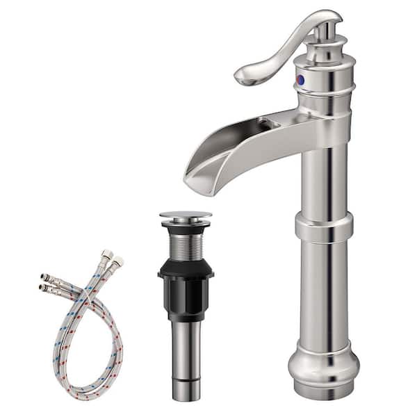Single Handle Waterfall Vessel Sink Faucet with Drain Kit Included in Brushed Nickel