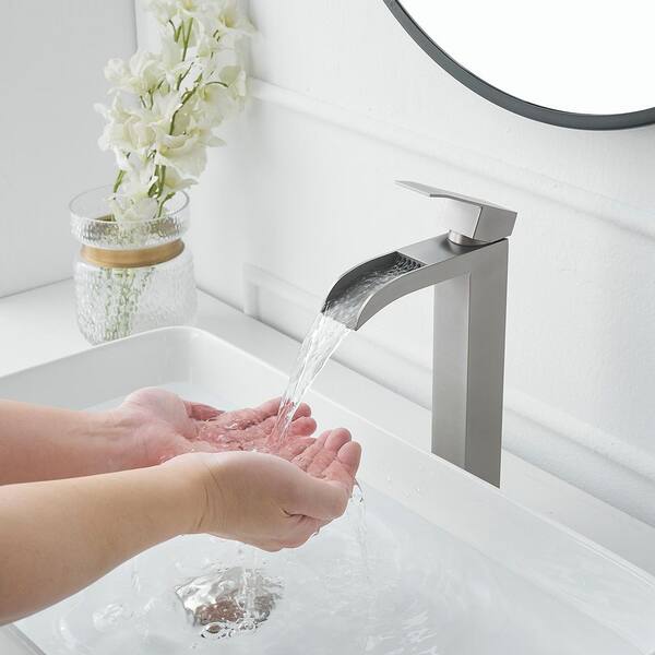 Waterfall Single Handle Vessel Sink Faucet with Drain Kit in Brushed Nickel