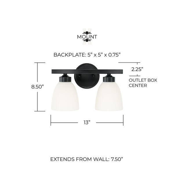 13 in. W x 8.5 in. H x 7.5 in. E 2-Light Soft White Glass Vanity Light in Matte Black