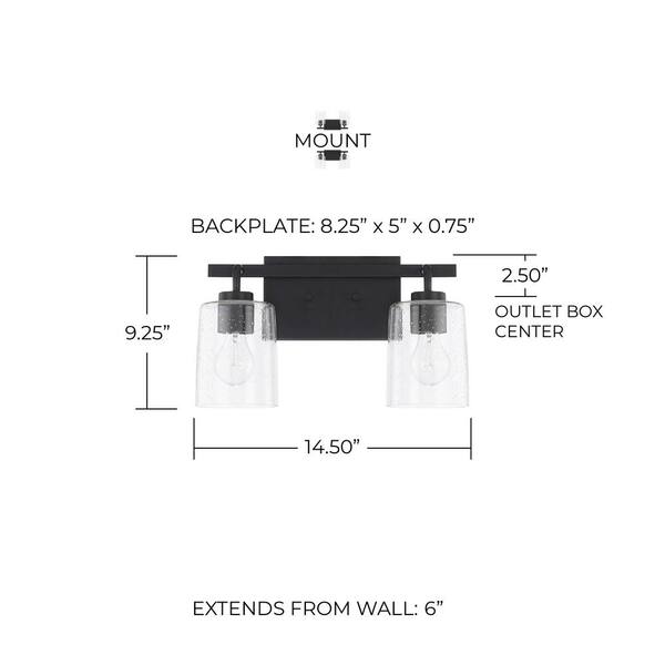 14.5 in. W x 9 in. H x 6 in. E 2-Light Clear Seeded Glass Vanity Light in Matte Black