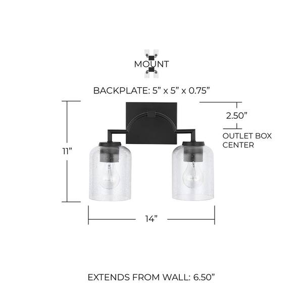 14 in. W x 11 in. H x 6.5 in. E 2-Light Clear Seeded Glass Vanity Light in Matte Black