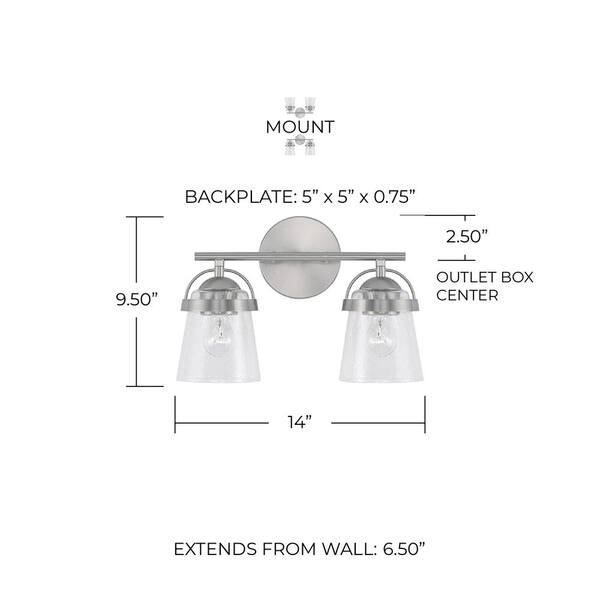 14 in. W x 9.5 in. H 2-Light Vanity Light in Brushed Nickel with Clear Seeded Glass