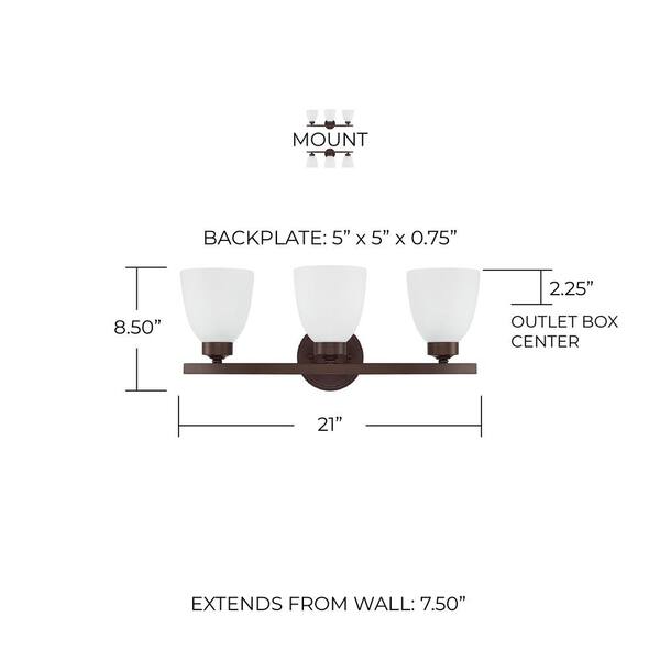 21 in. W x 8.5 in. H x 7.5 in. E 3-Light Soft White Glass Vanity Light in Bronze