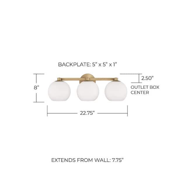 22.75 in. W x 8 in. H 3-Light Circular Globe Vanity Light in Aged Brass with Soft White Glass