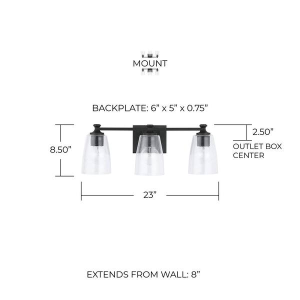 23 in. W x 8.5 in. H x 8 in. E 3-Light Clear Seeded Glass Vanity Light in Matte Black